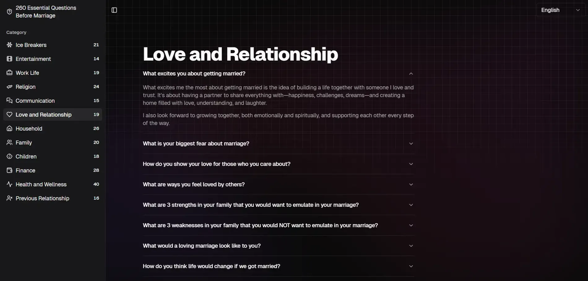 The questions cover a variety of important topics like family, finances, religion, career, past relationships, and more. On the website, you’ll also find sample answers for each of them.